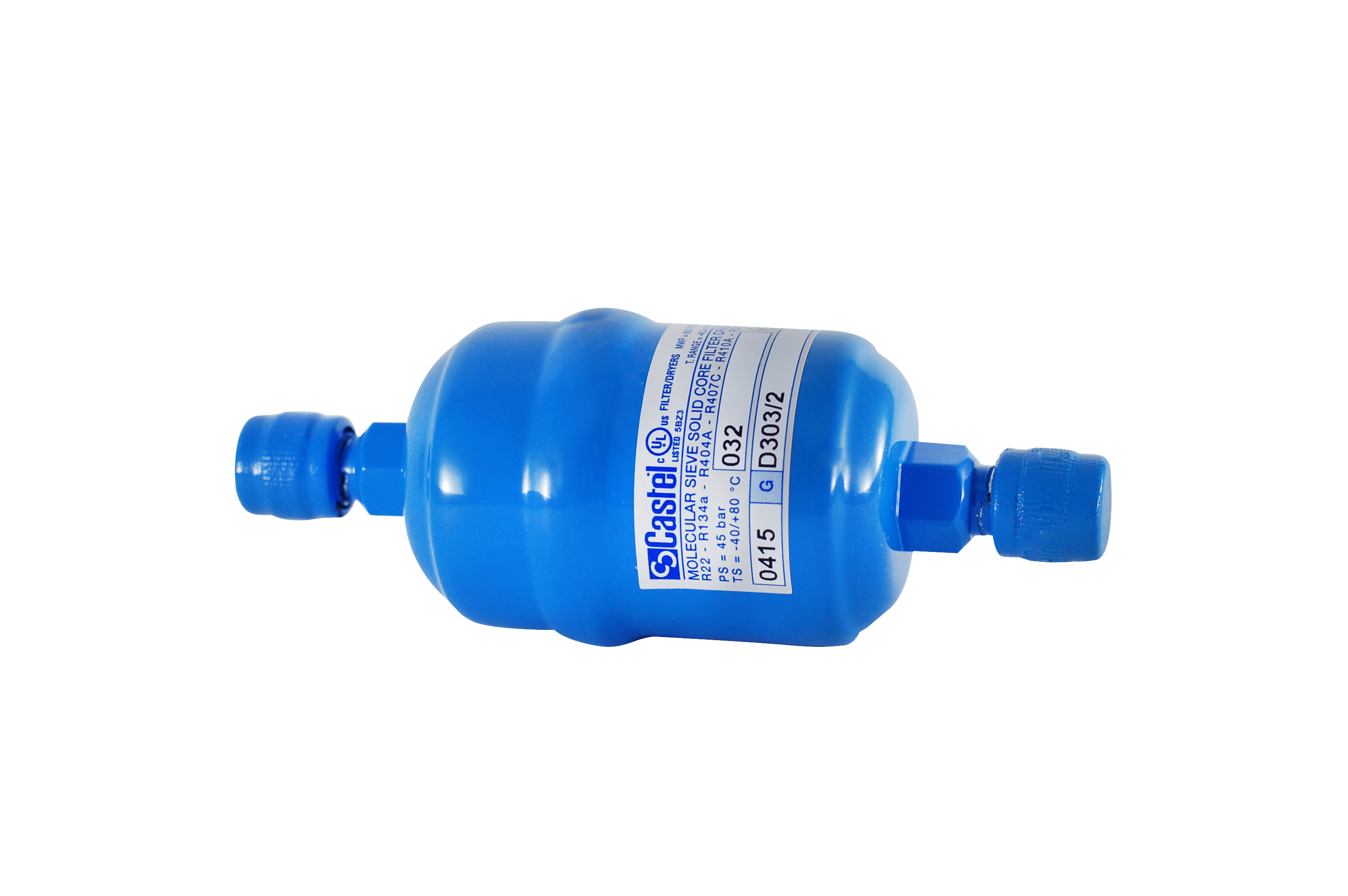 D303/2 Solid Core Filter Drier 1/4"SAE FLARE use with the following ASHRAE 34:2019 refrigerants, Class A1, A2L, or A3: HCFC (R22) HFC (R134a, R404A, R407C, R410A, R507) HFO (R1234ze) HFO + HFC (R448A, R449A, R450A, R452A, R513A, R515A, R515B) HC (R290, R600, R600a, R1270) Product Details Connections 1/4"" MALE SAE. Nominal volume [cm³] 50 PS [bar] 50 MWP [psi] (1) 680 TS [°C] min. -40 TS [°C] max. +80"