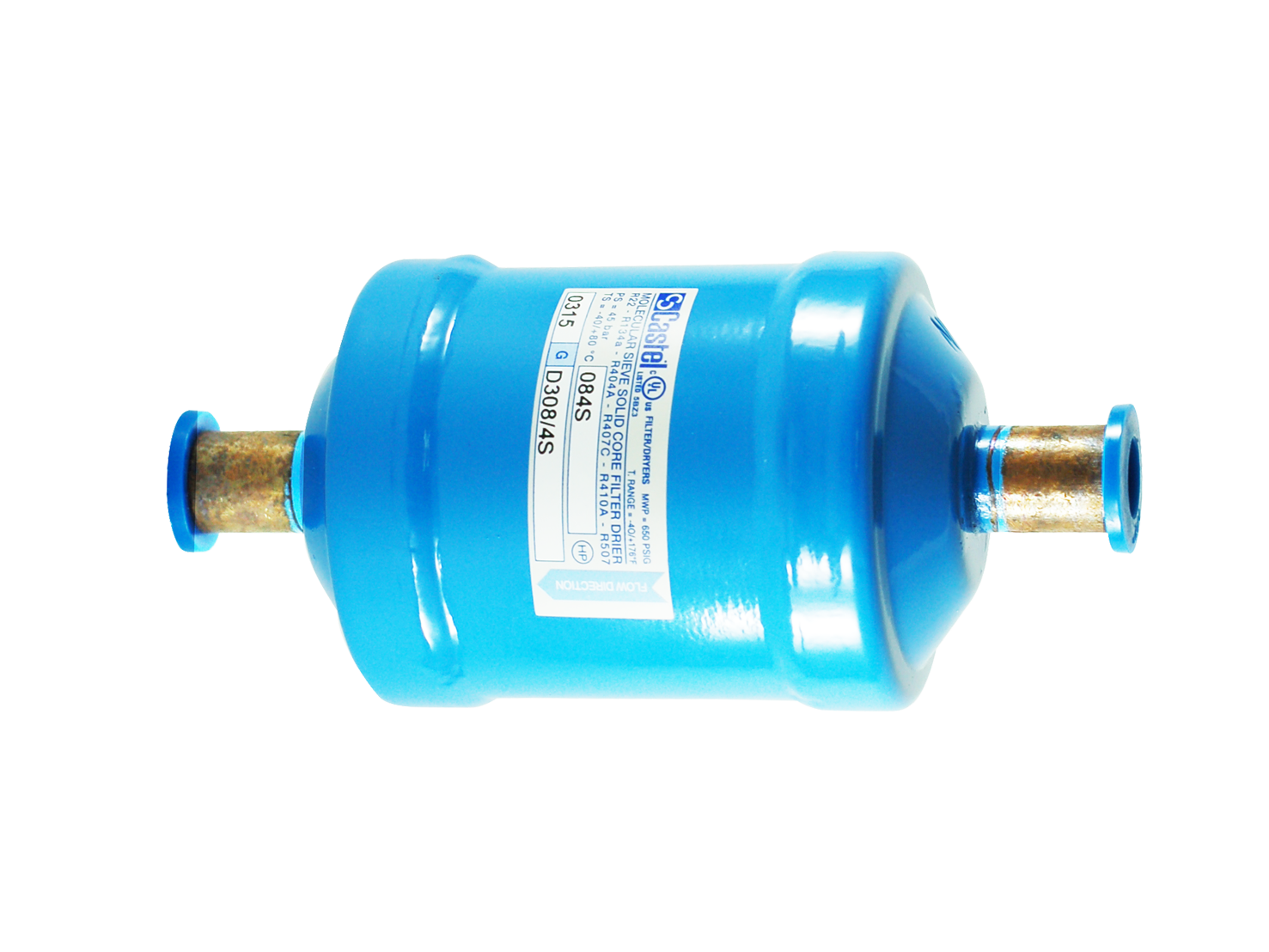 D316/4S Solid Core Bi-Flow Filter Drier 1/2" ODS use with the following ASHRAE 34:2019 refrigerants, Class A1, A2L, or A3: HCFC (R22) HFC (R134a, R404A, R407C, R410A, R507) HFO (R1234ze) HFO + HFC (R448A, R449A, R450A, R452A, R513A, R515A, R515B) HC (R290, R600, R600a, R1270) Product Details Connections ODS Ø [in.] 1/2"" Nominal volume [cm³] 250 PS [bar] 50 MWP [psi] (1) 680 TS [°C] min. -40 TS [°C] max. +80"
